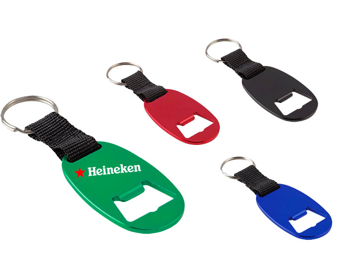 ESPARTA - Llavero destapador en color, con cinta y arillo para colgar....