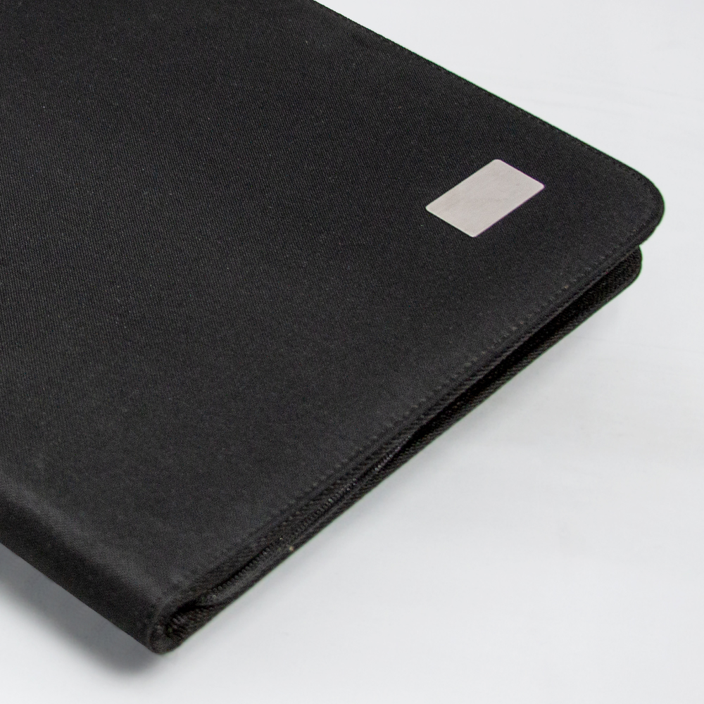 QANA Carpeta con cubierta exterior de poliéster 300D e interior de PU. Placa metálica para grabado y cierre. Compartimentos para tarjetas, sujetador de bolígrafo bolígrafo, porta celular. Cintas elásticas para sujetar diversos artículos y soporte con velcro para tablet o celular. Bloc A4 con 20 hojas rayadas.
