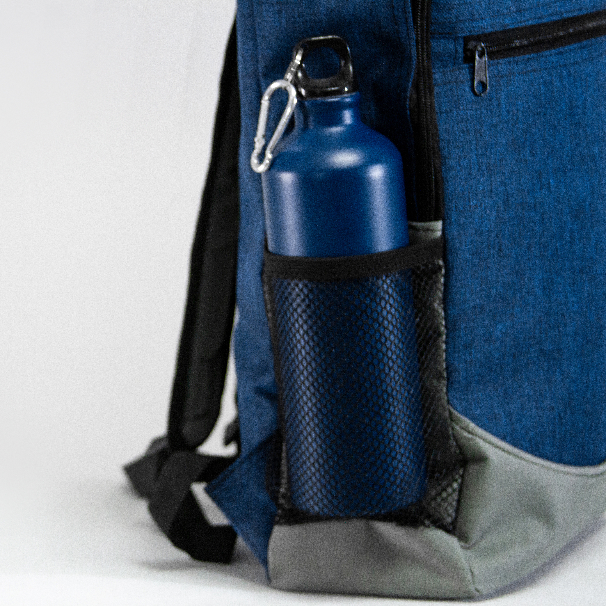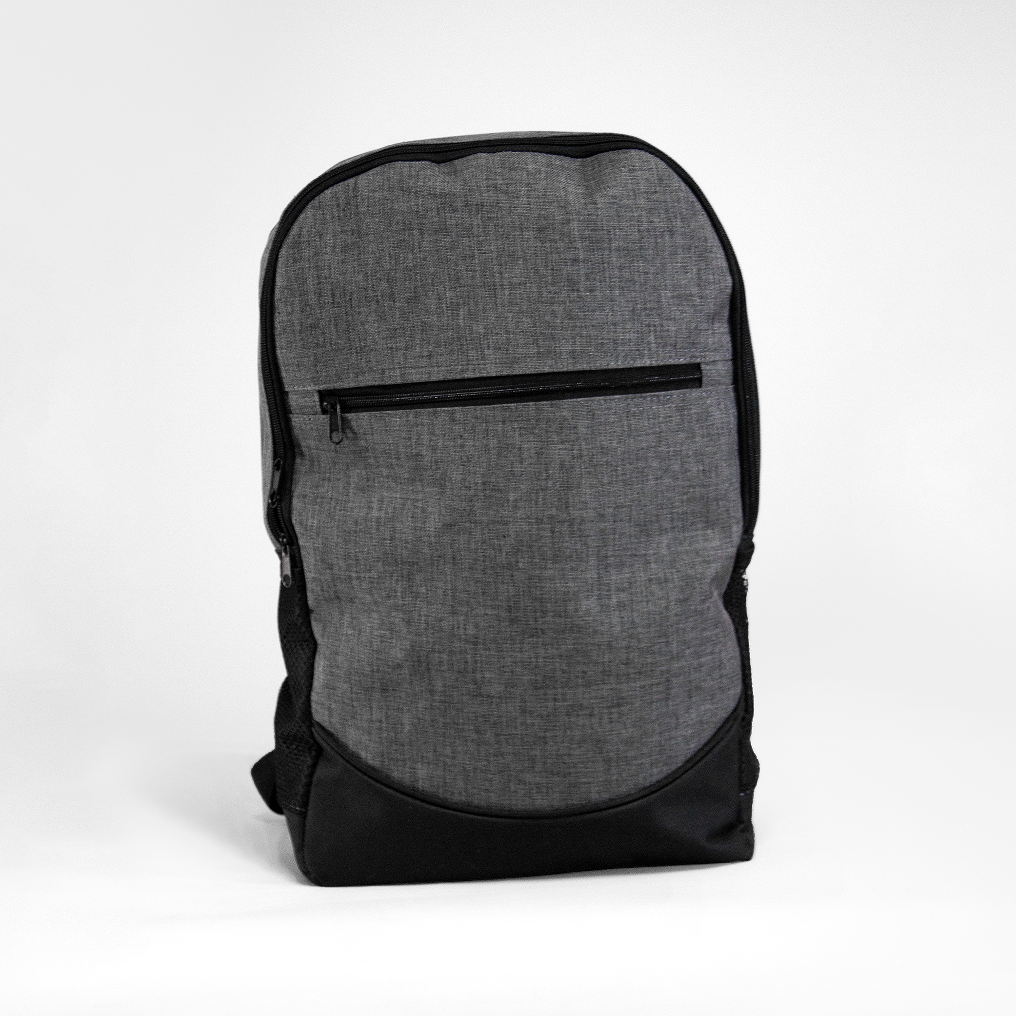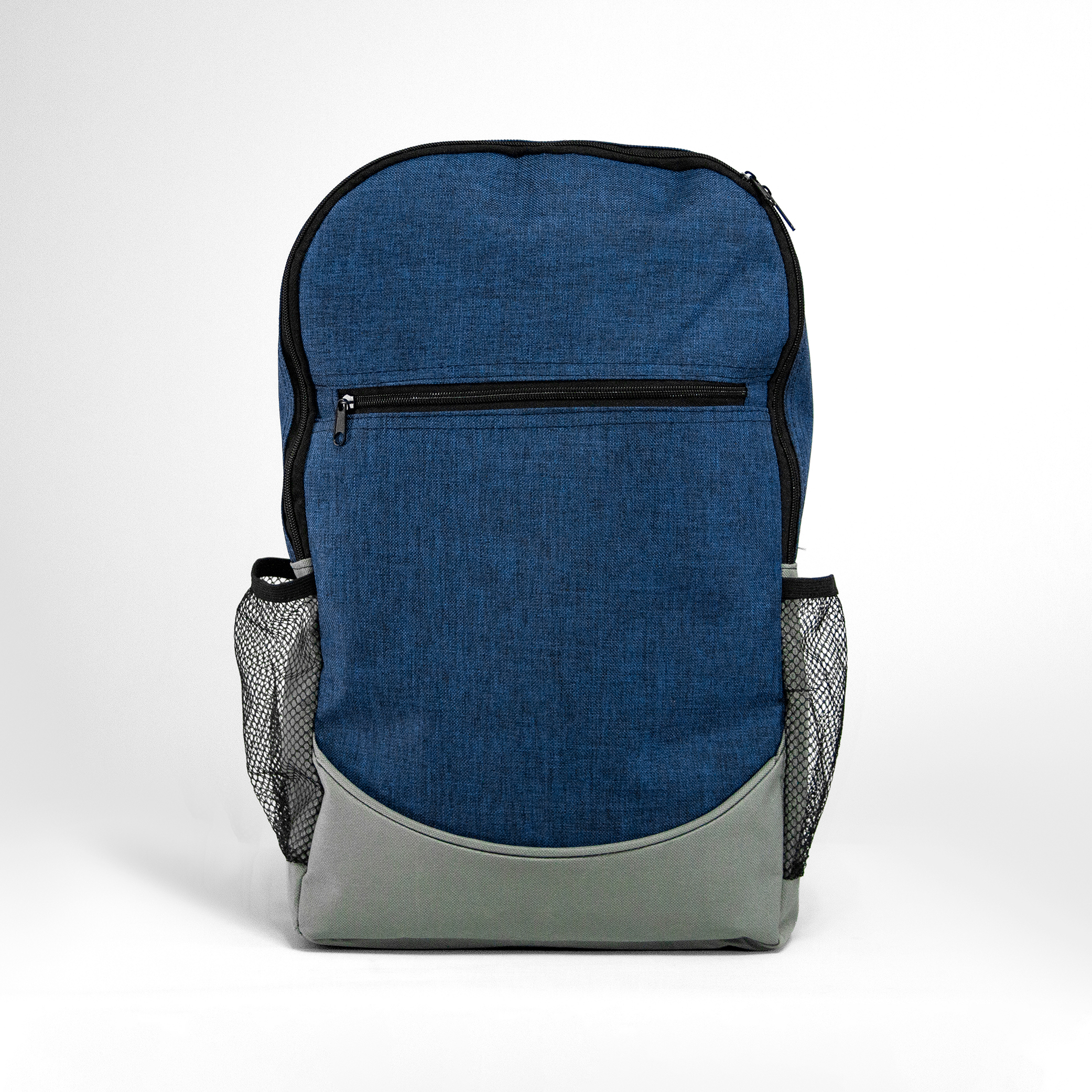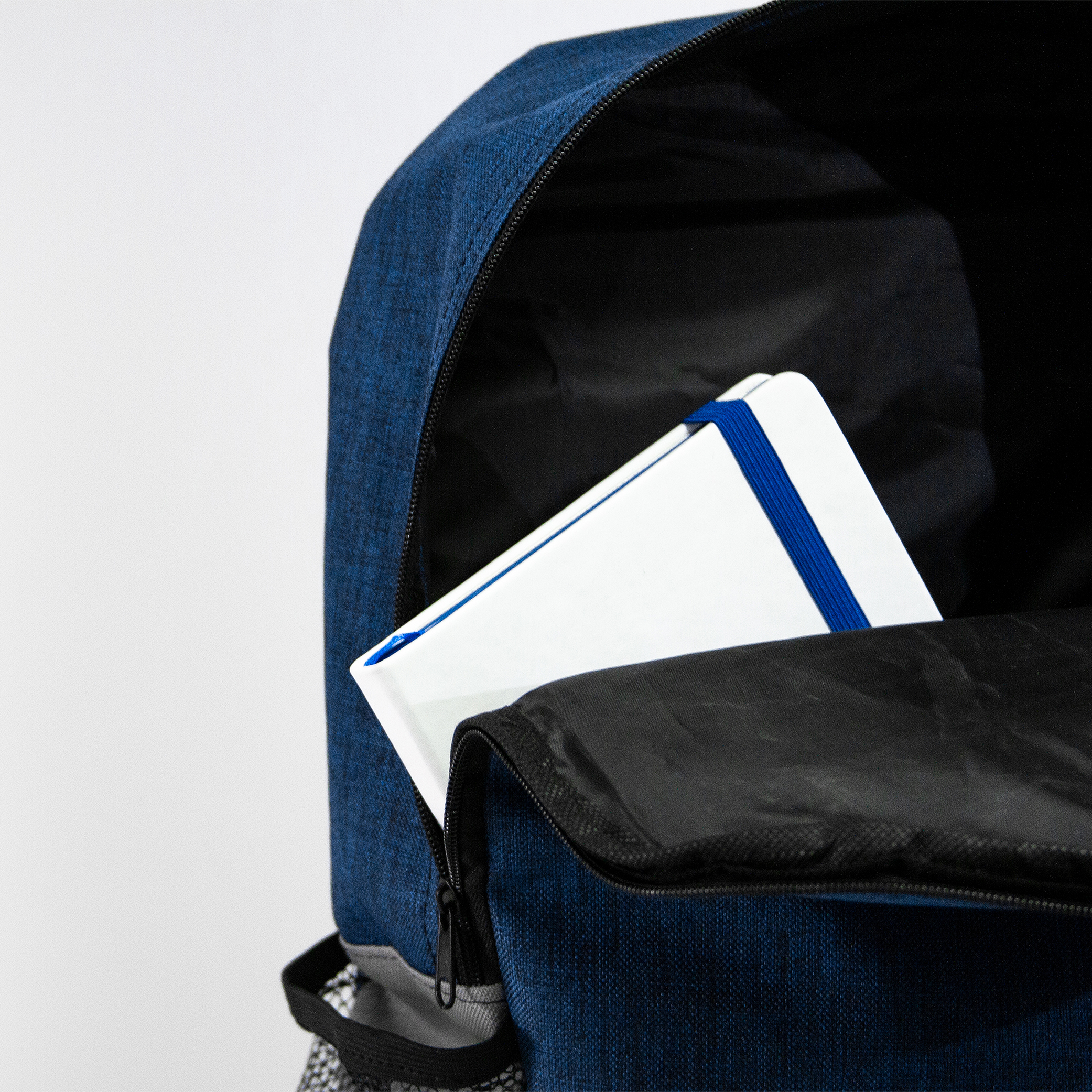 Mochila de poliéster con bolsa principal alcolchada. Bolsas laterales de malla, compartimiento frontal y salida para audífonos.