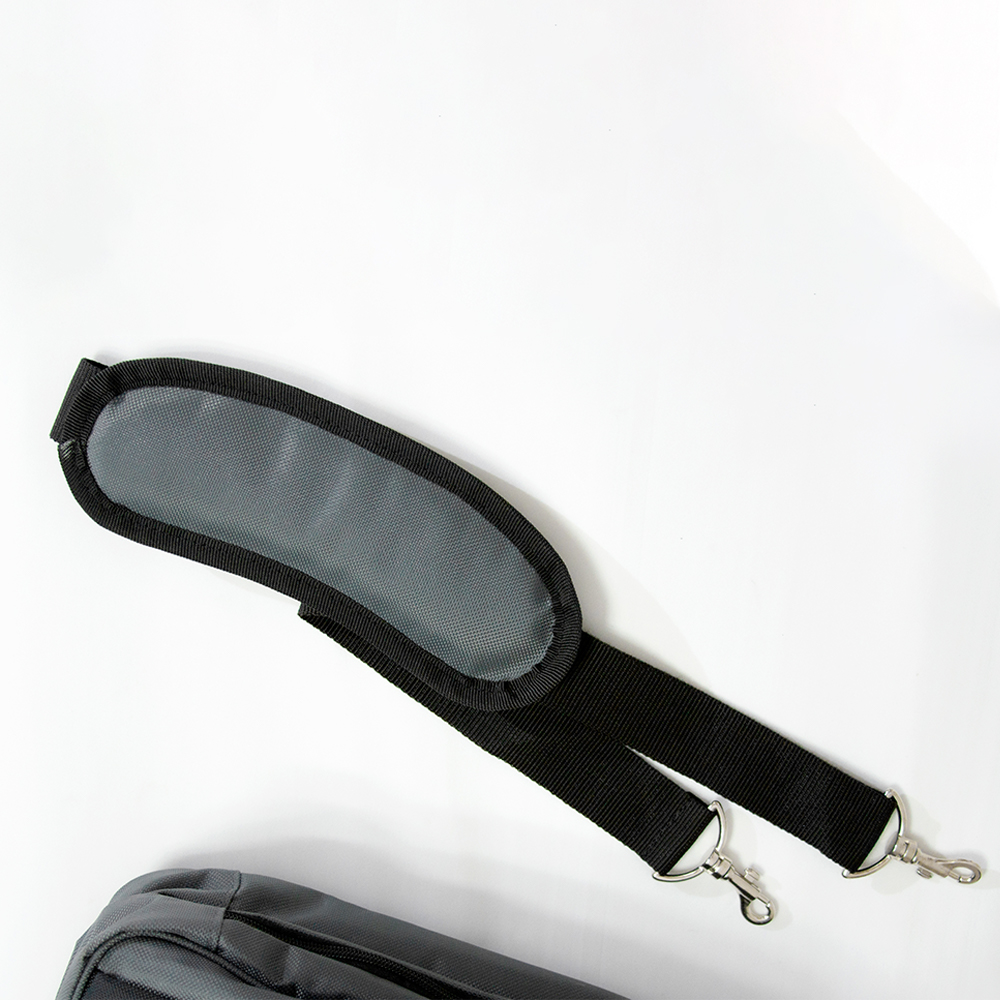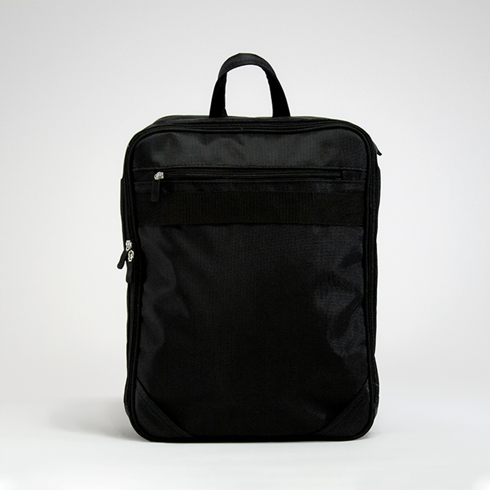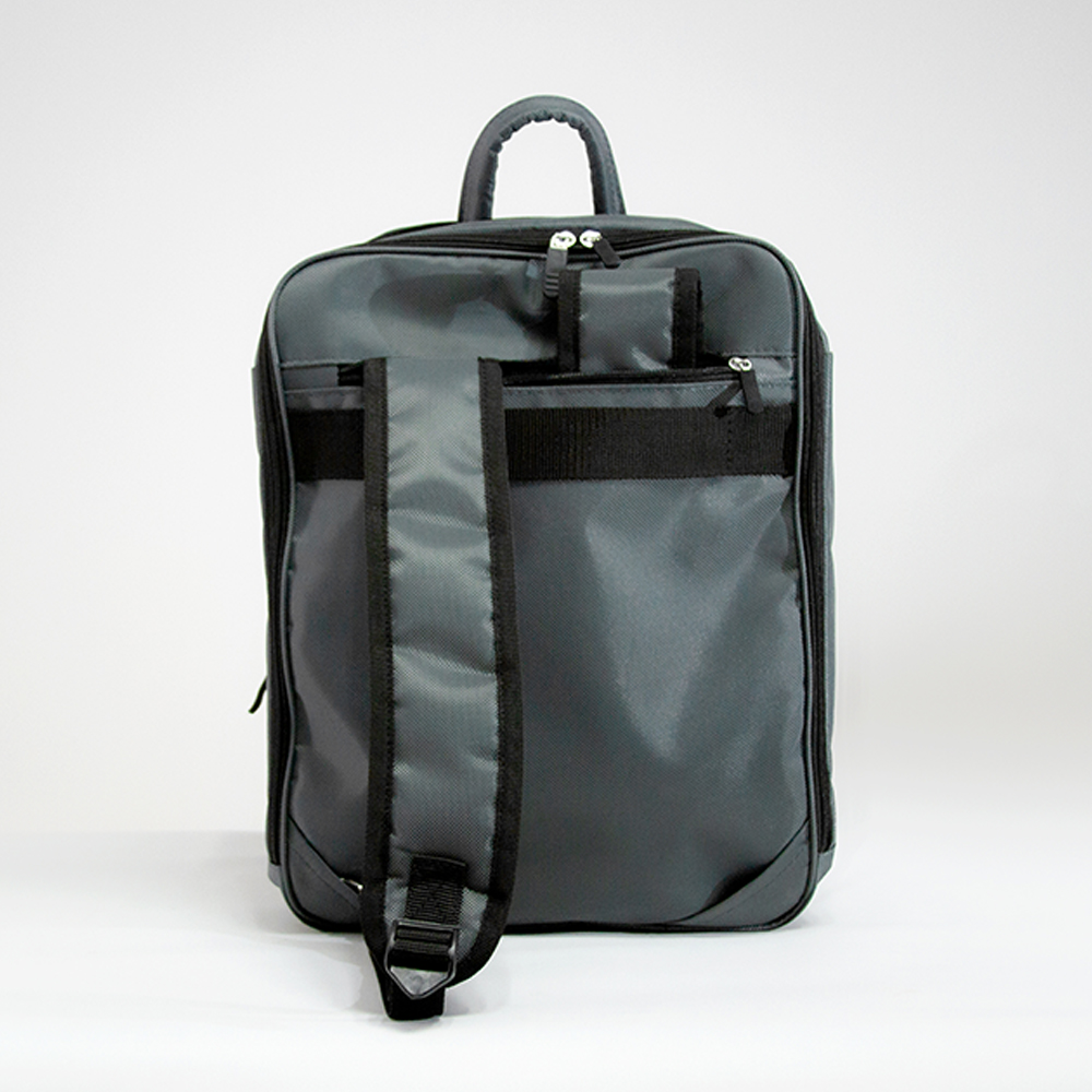 Mochila-Portafolio de poliéster. Bolsa frontal con compartimientos para bolígrafos, espacio para celular y power bank. Bolsa intermedia acolchada para laptop y bolsillos para accesorios. Bolsa portadocumentos y tablet. Bolsa posterior con cierre para guardar tirantes acolchados que se colocan para usarse como mochila. Asa ajustable y desmontable al hombro para usarse como portafolio. Incluye salida de audífonos y placa metálica.