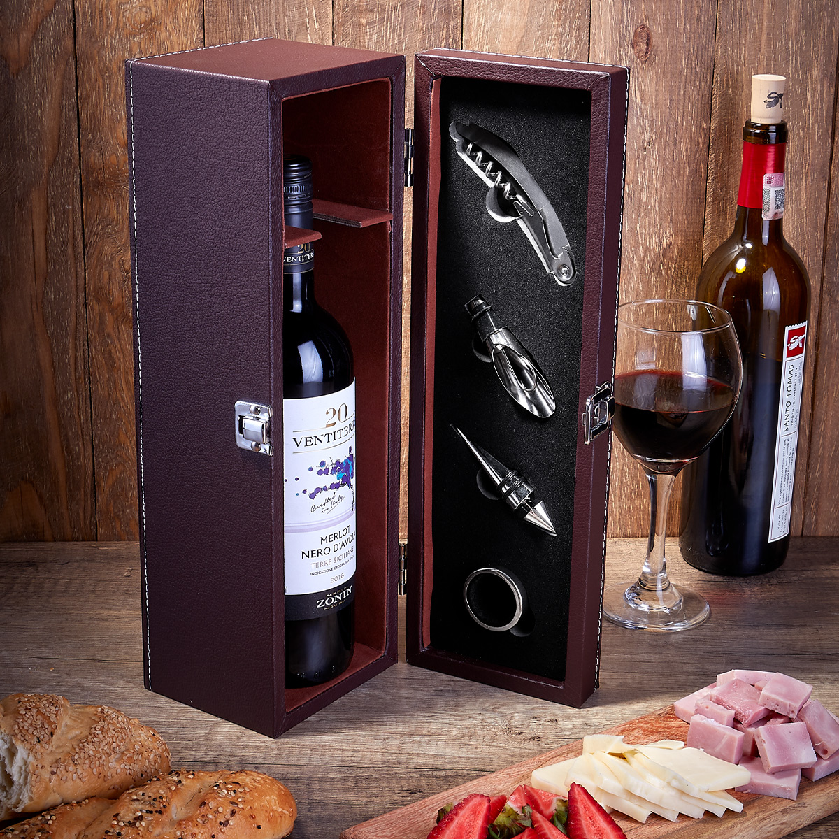 SET PARA VINOS PAMPLONA - Incluye sacacorchos con navaja y destapador, stopper, boquilla, arillo y estuche con espacio para almacenar una botella (no incluida).