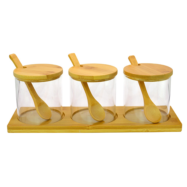 MATERIAL: Vidrio y Bamboo MEDIDAS: Frasco: 8.6. x 7.5 cm diametro. Base: 23 x 9 cm