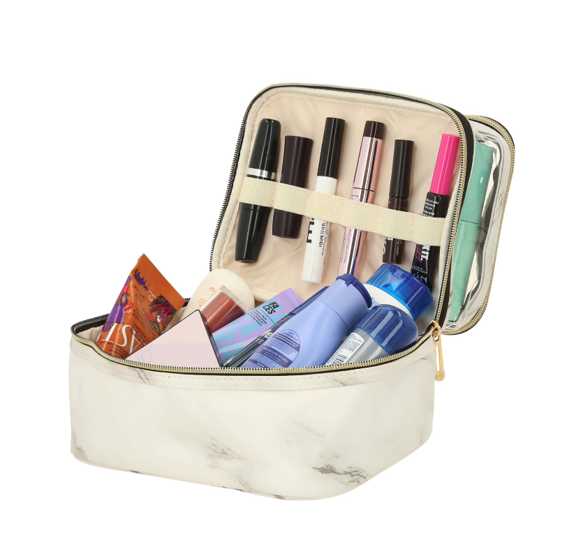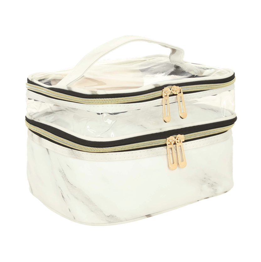 JOLIE Cosmetiquera con apariencia de mármol, doble nivel, uno color sólido, uno transparente con asa en la parte superior y fuelle de 17 cm.