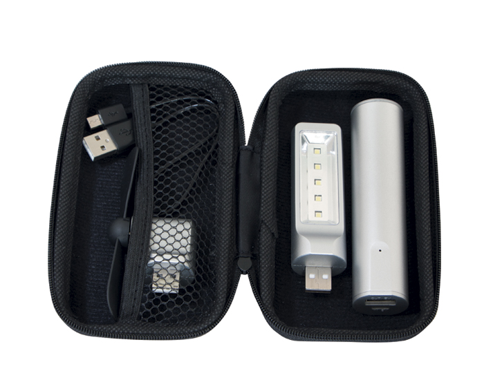 SAVE - Kit de accesorios con batería de carga portátil 2200 mAh, lámpara LED y mini ventilador. Incluye estuche y cable de carga.