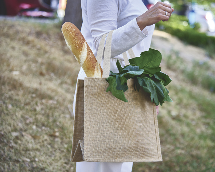 CANCÚN - Bolsa de yute con interior laminado, fuelle y asas de algodón.