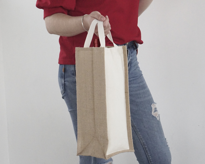 VINAGRETO - Bolsa de algodón cosida, ideal para botellas de vino, con laterales de yute e interior plastificado y asas de algodón.