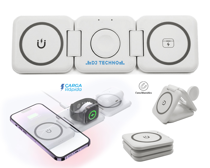 CRASH - Multicargador inalámbrico de carga rápida plegable con imán 3 en 1. Incluye: compartimento de carga para celular, para reloj inteligente (carga solo dispositivos Apple Watch) y para audífonos. Cuenta con 2 indicadores LED de carga. Entrada de carga tipo C (incluye cable de carga). Compatible con dispositivos iOS. Presentación: caja de regalo a color. (Verifique la compatibilidad con sus dispositivos móviles).