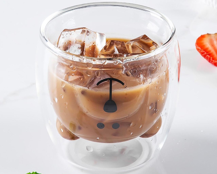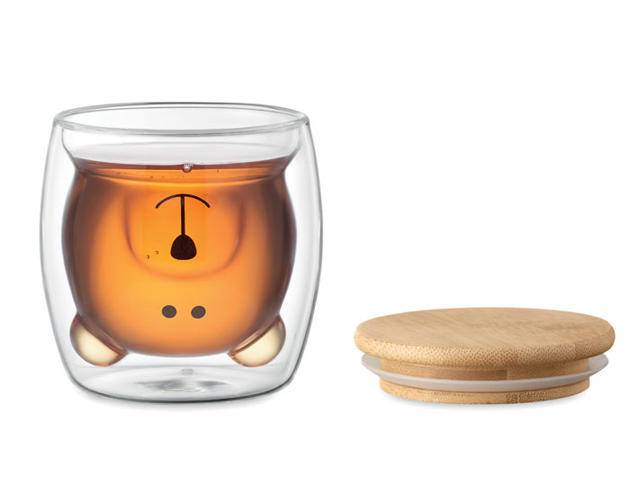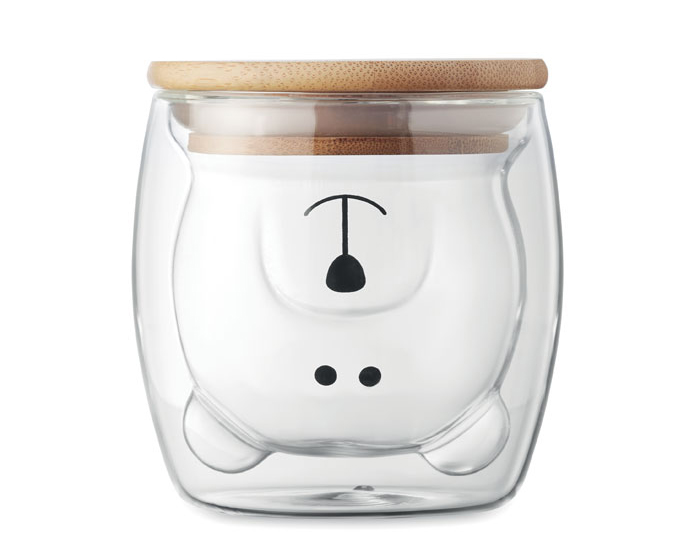 PIPO - Vaso de vidrio de borosilicato de doble pared con cara de oso. Cuenta con tapa de bambú y sello de silicón. CAP. 220 ml. Presentación: Presentación: caja en color blanco.
