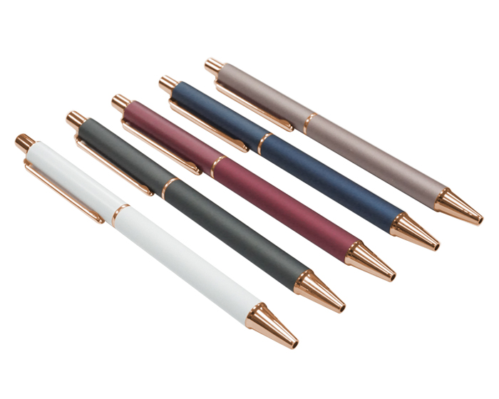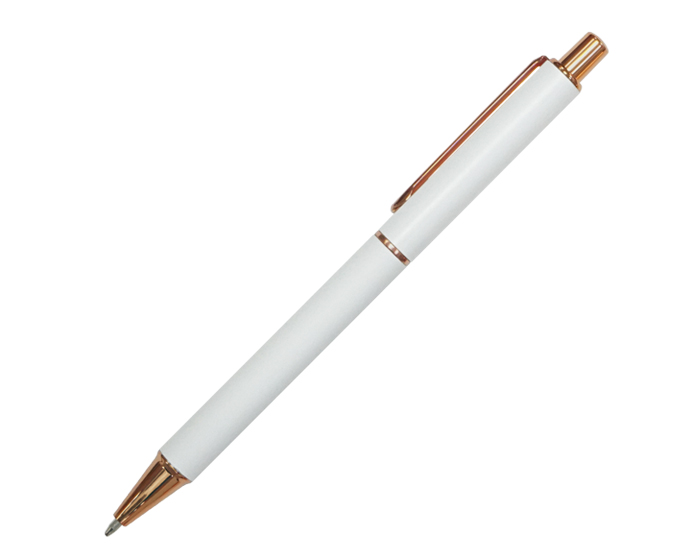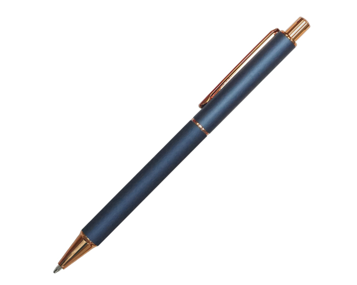 VERDI - Bolígrafo delgado de aluminio, con botón, clip, detalle central y punta, cromados en color Oro rosa. Barril superior con acabado metálico mate y barril inferior en el mismo color, con acabado de goma. Mecanismo de click.