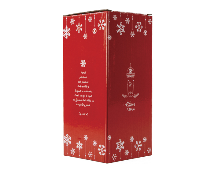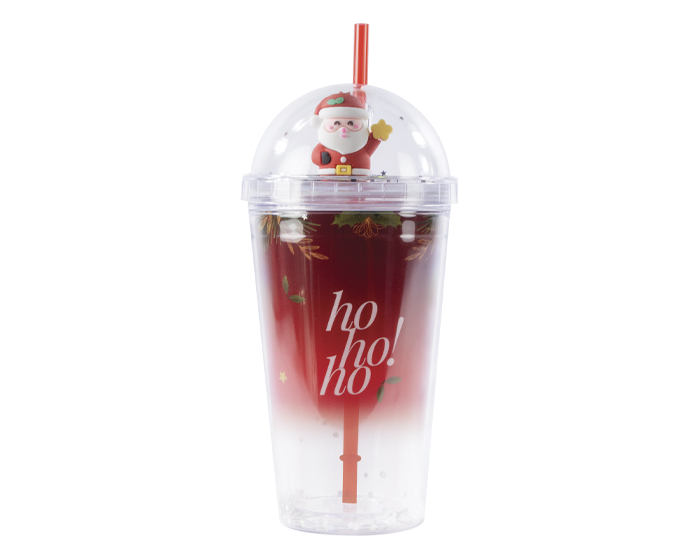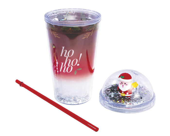 KLAUS - Vaso de plástico de doble pared con diseño navideño y lentejuelas en su interior. Cuenta con tapa de cúpula con figura de Santa Klaus con lentejuelas y popote. CAP. 500 ml. Presentación: caja de regalo de color. *BPA FREE.