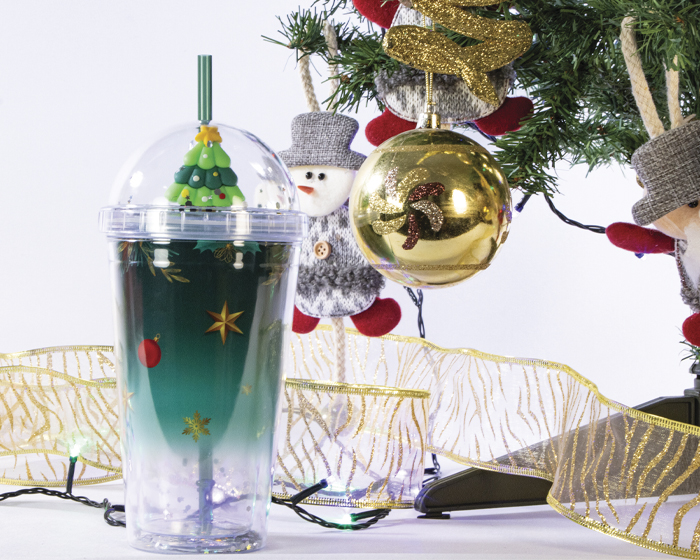 PINE - Vaso de plástico de doble pared con diseño navideño y lentejuela en su interior. Cuenta con tapa de cúpula con figura de Árbol de Navidad con lentejuelas y popote. CAP. 500 ml. Presentación: caja de regalo de color. *BPA FREE.