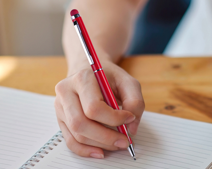 ODDRA DE TINTA AZUL - Bolígrafo metálico delgado y ligero de tinta azul, es de color sólido con acabado brillante, cuenta con clip, punta y detalles en cromo. Tiene touch del color del bolígrafo para dispositivos táctiles. Mecanismo retráctil.