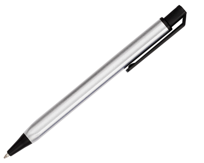 PRINCE - Bolígrafo metálico brillante, punta y clip de plástico en color negro. Diseño ergonómico de cuerpo triangular. Mecanismo de click.