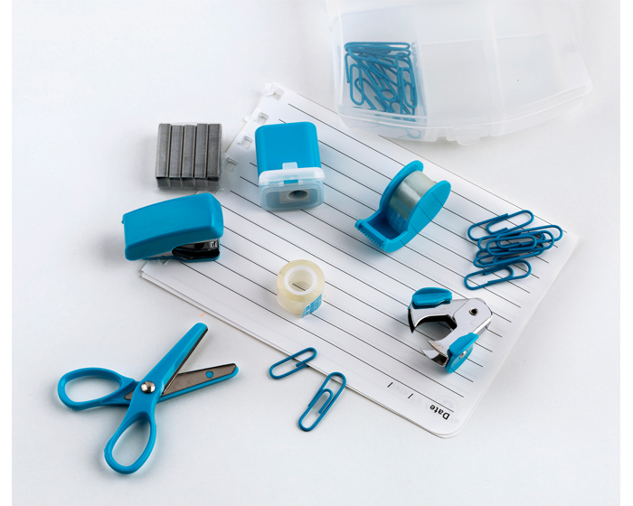 MARS - Set de escritorio que incluye clips para papel, sacapuntas, mini engrapadora, grapas, saca grapas, tijeras, mini despachador de cinta adhesiva y cinta de repuesto. Presentación: estuche de plástico transparente.