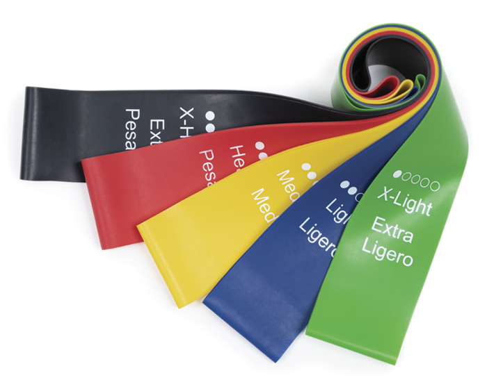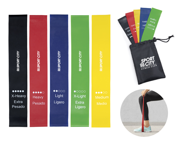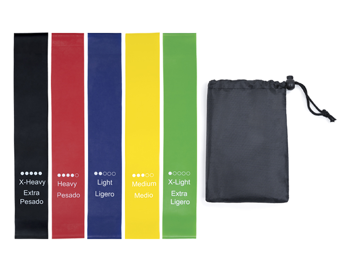 GYMTIME - Set de ligas de resistencia de latex antiadherible de diferente tensión para ejercicio 5 en 1: cada liga cuenta con diferente tipo de dureza de acuerdo al nivel de ejercicio: color verde - extra ligero, azul - ligero, amarillo - medio, rojo - pesado y negro - extrapesado. Cuenta con funda con jareta para guardar.