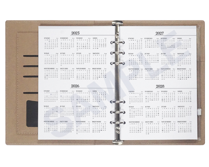 HILTON - Carpeta tipo agendario organizador de pasta rígida de 6 arillos de metal, su cubierta cuenta en la parte interna con 4 compartimentos para credenciales, uno con ventana plástica, sujetador para bolígrafo. Contiene: Hoja de dedicatoria, hoja de datos de contacto, calendarios del 2025 al 2028, planificadores anuales (4), planificadores de gastos (4), planificadores de proyectos (5), hojas rayadas y hojas punteadas para notas. Incluye: regla de 20 cm, bolsa de PVC con cierre a presión y bolígrafo de aluminio acabado brillante con detalles en cromo. Puedes adquirir el repuesto Parker en tinta azul para este bolígrafo. Presentación: Caja en color negro.