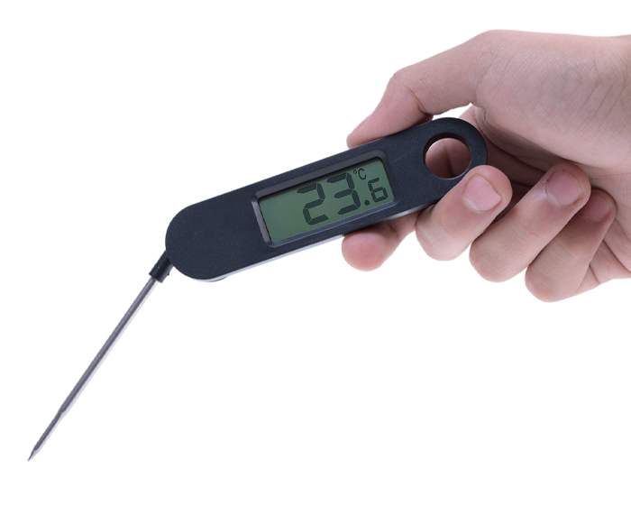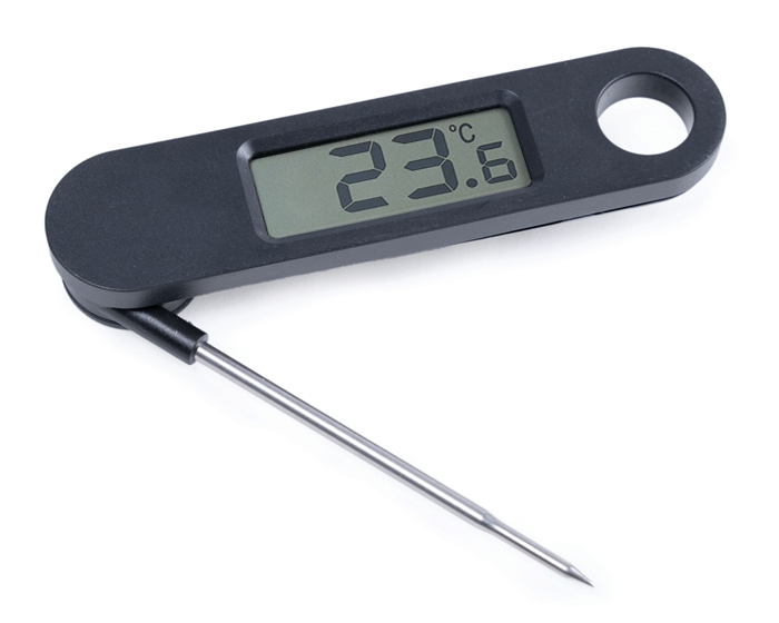 MEAL - Termómetro de cocina con pantalla digital, cuenta con aguja plegable de acero inoxidable para medir la temperatura de carnes, agua o alimentos; tiene arillo para colgarse o sostenerse e imán en la parte trasera. El termómetro se apaga automáticamente en un lapso de 10 min. Botón de unidad de Medición: grados centígrados y grados Fahrenheit, Rango de resistencia: de -20 a 250 grados centígrados. Incluye una batería de botón. Presentación: caja de color.