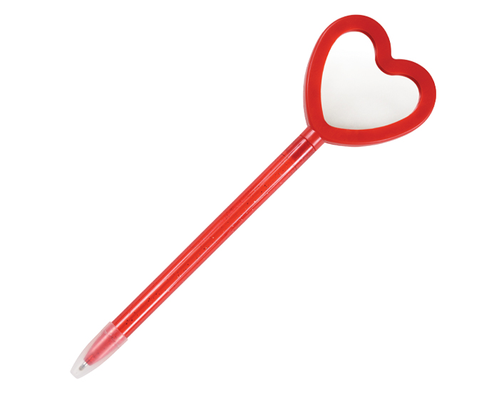 LATIDO - Bolígrafo delgado de plástico traslucido con cuerpo de glitter y forma de corazón con espejo.