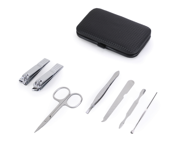 NAYLA - Set de manicure con broche que contiene: cortauñas plano, cortauñas con punta diagonal, tijeras, lima, pinzas de depilar, empujador de cutícula y limpiador de oidos. Presentación: caja individual de kraft.