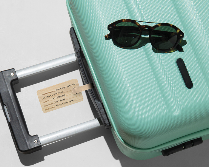 MARRUECO - Identificador de equipaje de bambú. Cuenta con una pulsera de PVC y datos personales en español/inglés.