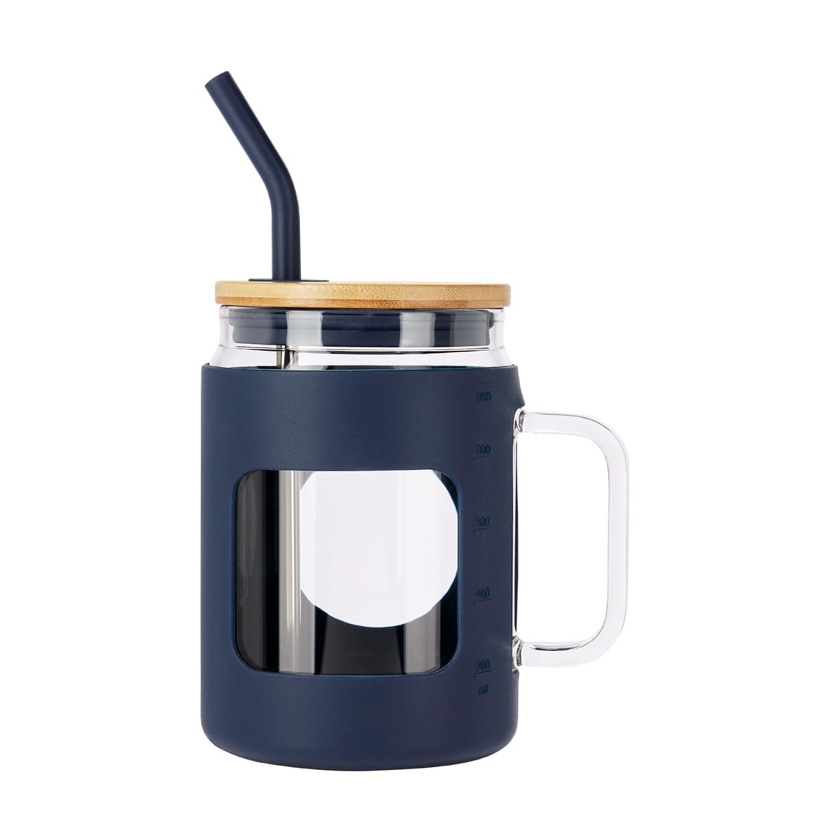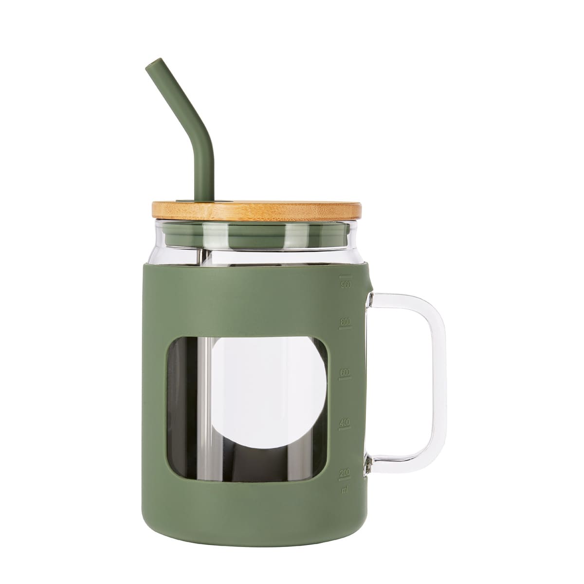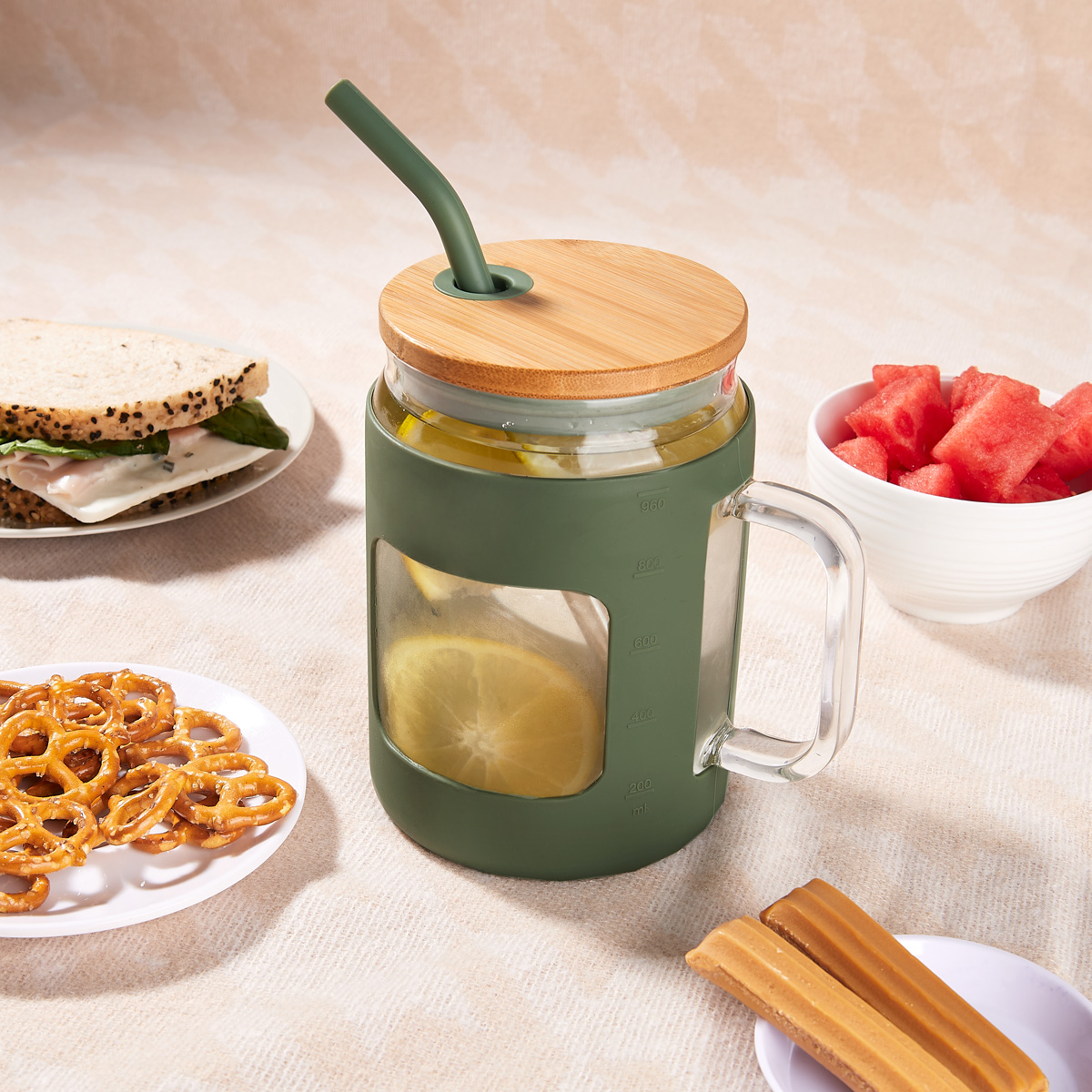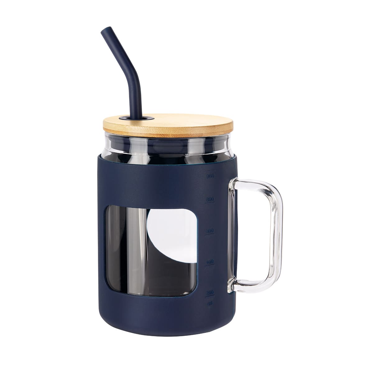 CILINDRO DE VIDRIO MASON - Cilindro de vidrio con asa y manga de silicón graduada en ml. Tapa de bambú con sistema de push y ranura para popote. Incluye popote metálico con boquilla de silicón. Vidrio resistente a bebidas calientes y frías. Caja individual incluida. El bambú es un producto natural el cual puede presentar variaciones en tonalidades y vetas. Este producto por ser últimas piezas puede presentar alguna variación, no se aceptan devoluciones.