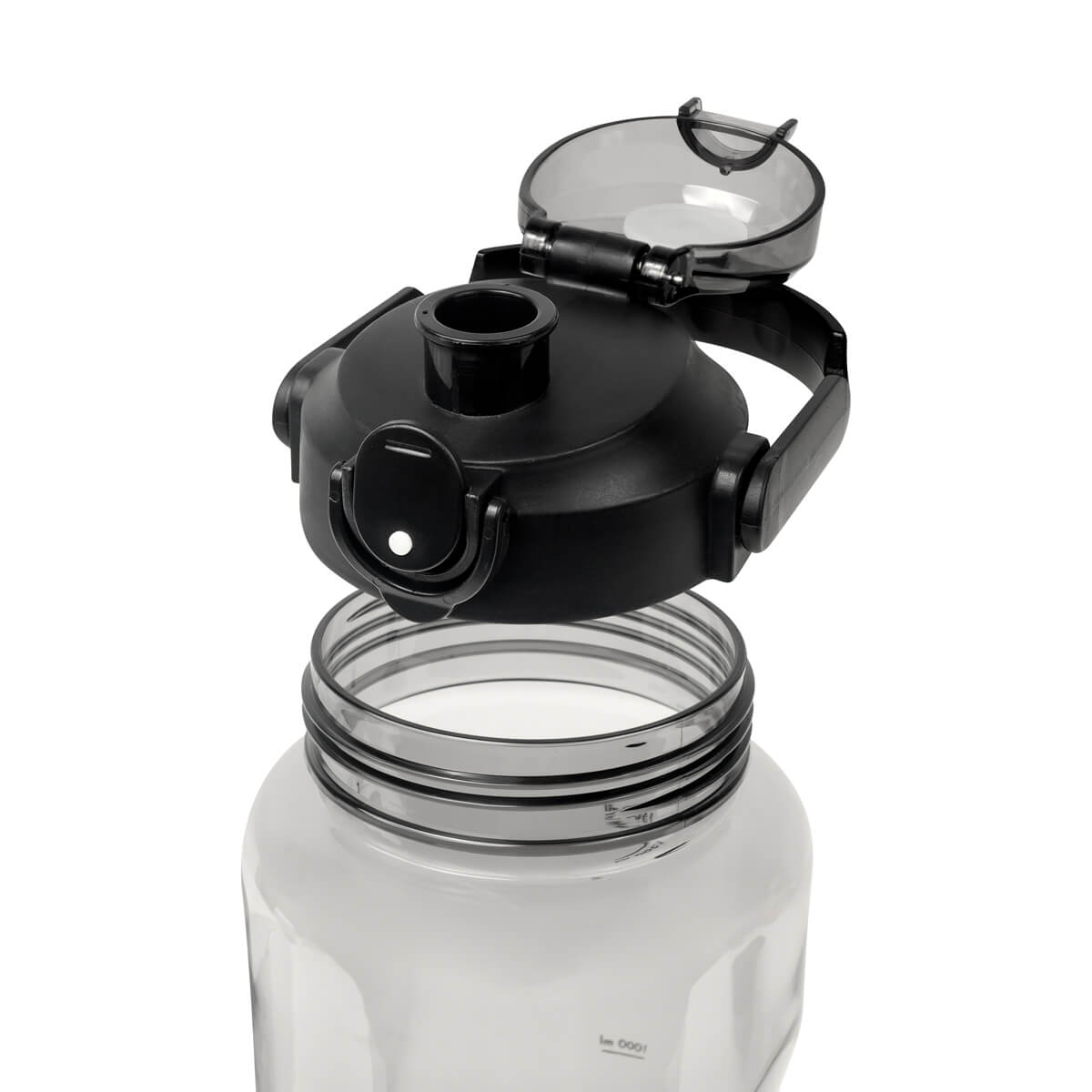 CILINDRO JUJUY - Tapa de plástico con cierre de rosca y boquilla, sobretapa push con botón de seguridad y asa plegable con phone holder para colocar el celular. Cuerpo traslúcido, resaques laterales para un mejor agarre, indicador de mililitros para motivar y controlar tus hábitos de hidratación. Incluye caja individual.