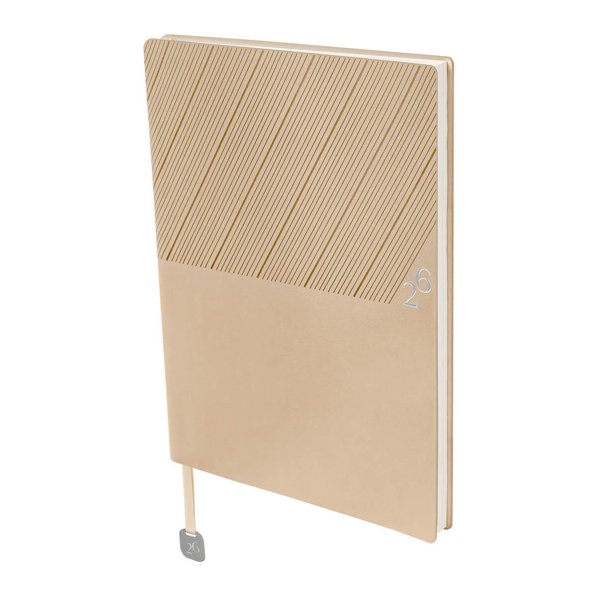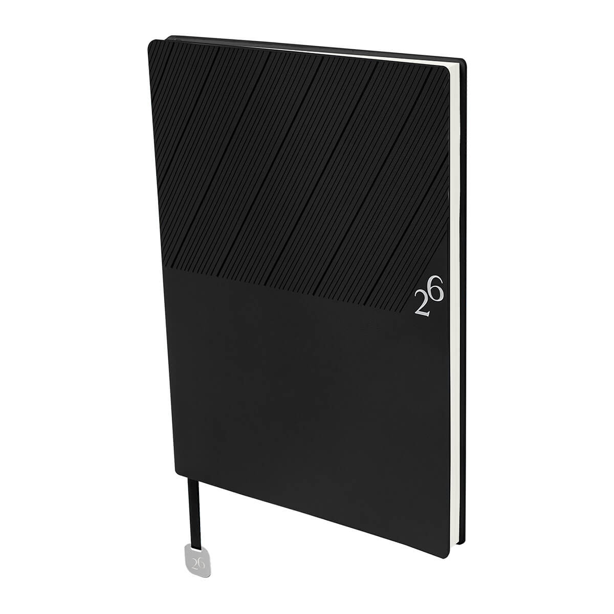 AGENDA SEMANAL CLÁSICA 2026 - Agenda semanal con 100 hojas. Contiene datos personales, calendarios 2025-2026-2027, planeador 2026, presupuesto de gastos, seguimiento de nuevos hábitos, organizador de tareas, planeador de proyectos y días festivos. Incluye caja individual del mismo color a la agenda, separador con placa metálica y bolígrafo.