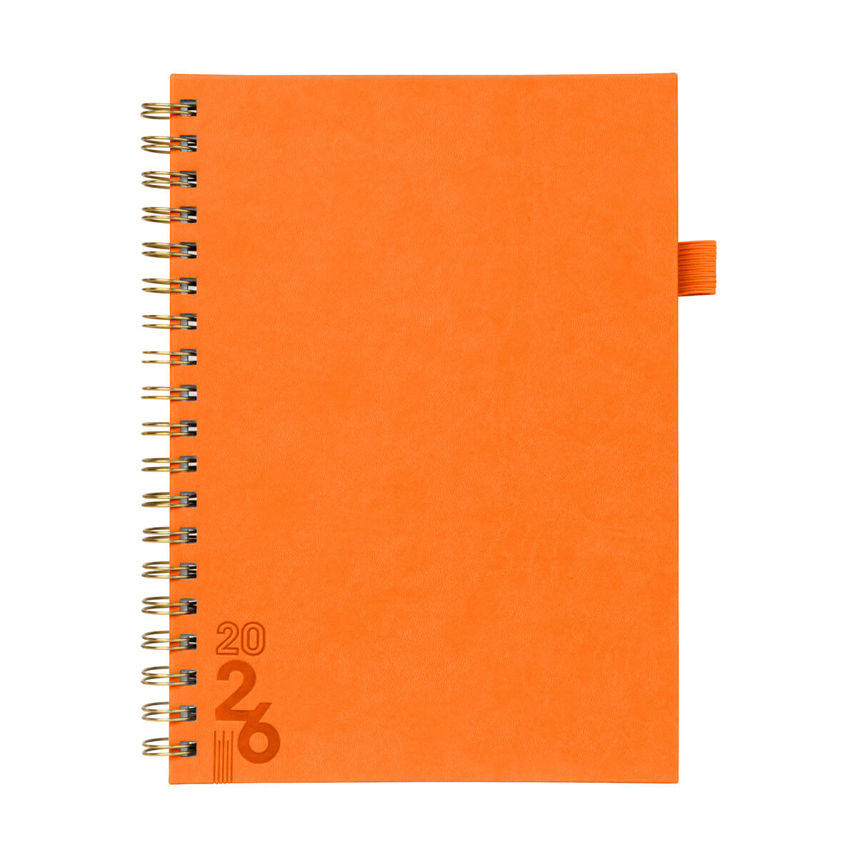 AGENDA SEMANAL TERRA 2026 - Agenda semanal con 80 hojas. Contiene datos personales, calendarios 2025-2026-2027, planeador 2026, seguimiento de nuevos hábitos, organizador de tareas, planeador de proyectos y días festivos. Incluye caja individual del mismo color a la agenda y bolígrafo.