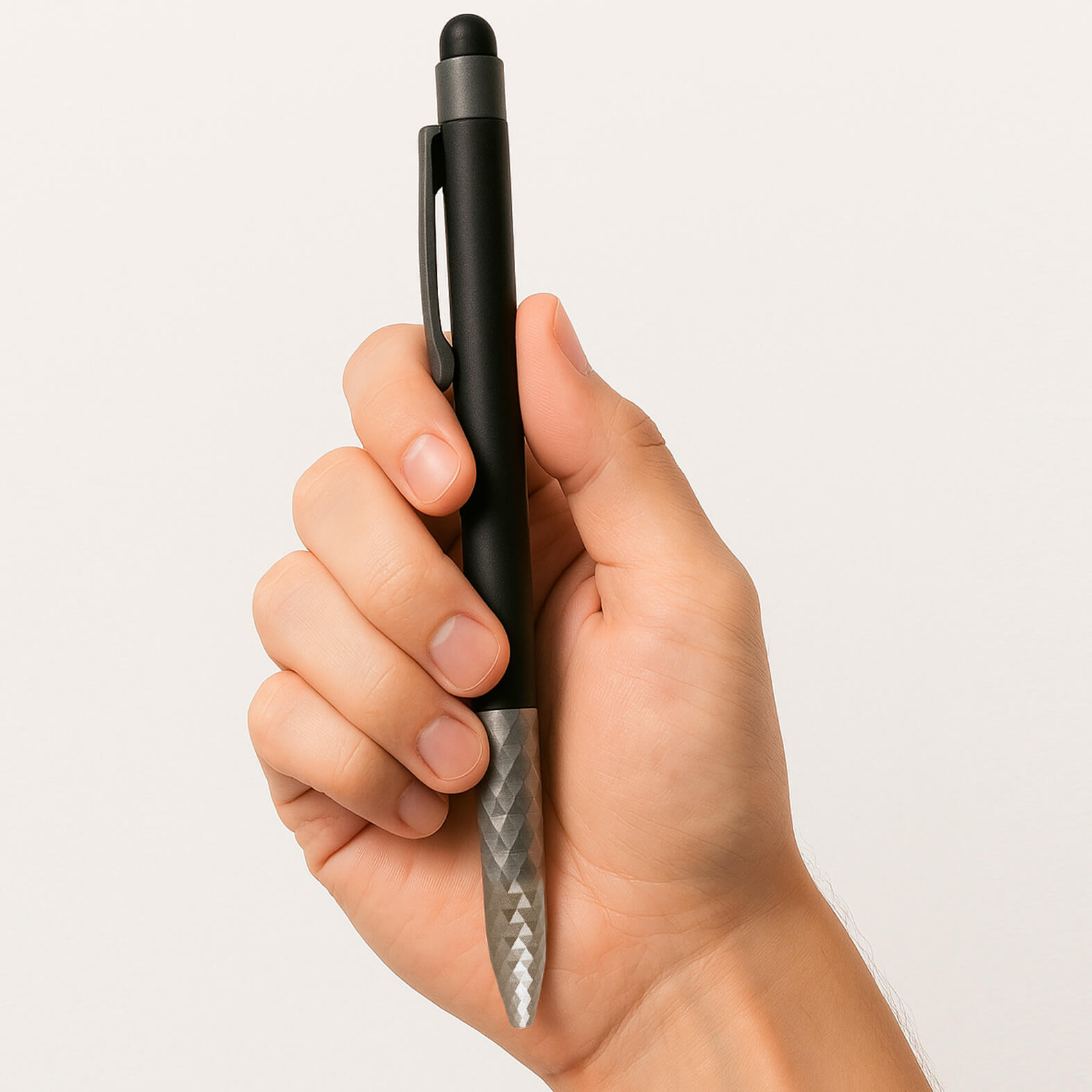 ALBORA Bolígrafo metálico con acabado rubber en la parte superior del barril, clip, goma touchscreen y mecanismo de click.