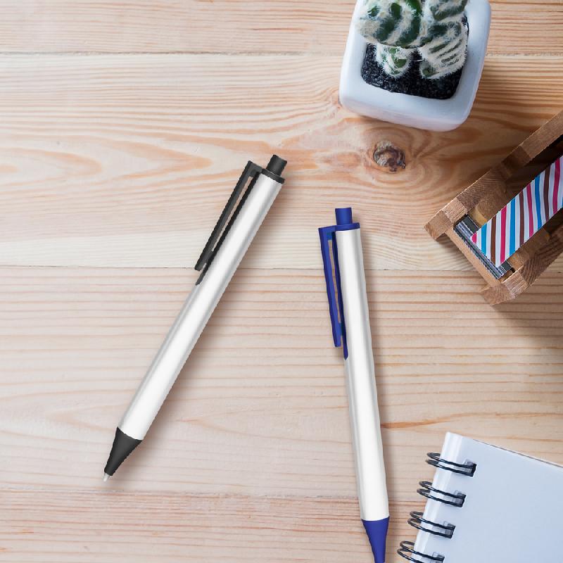 Bolígrafo de plástico con barril en plata y mecanismo de click en color negro o azul.