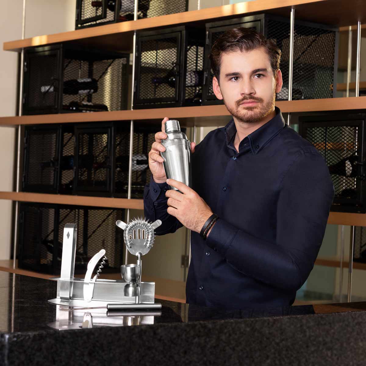SET SKOPJE - Set para preparación de bebidas con base. Incluye shaker, pinzas, dosificador, colador, cuchillo, sacacorchos con navaja y destapador.