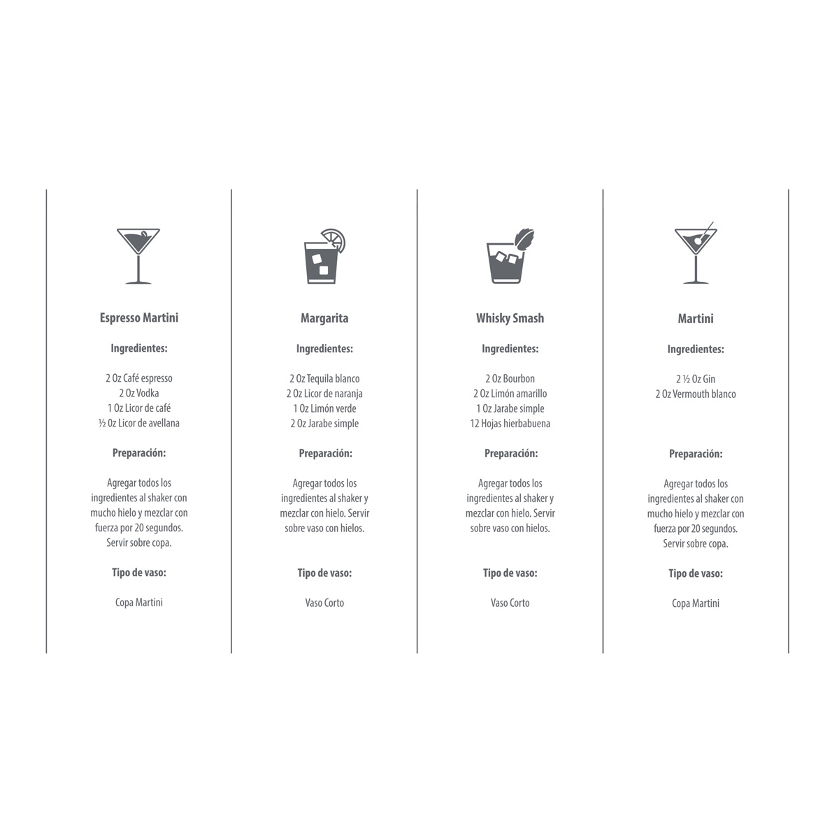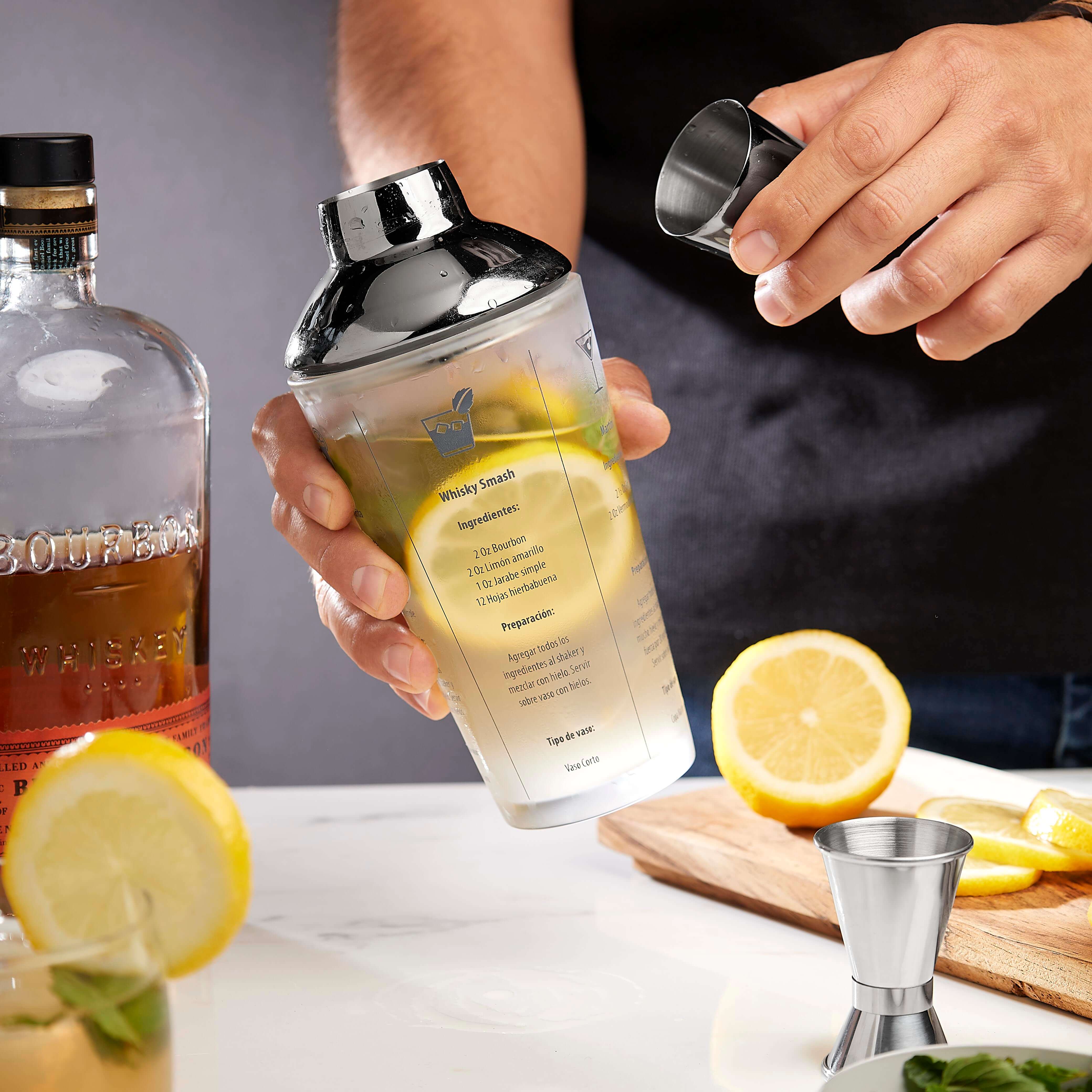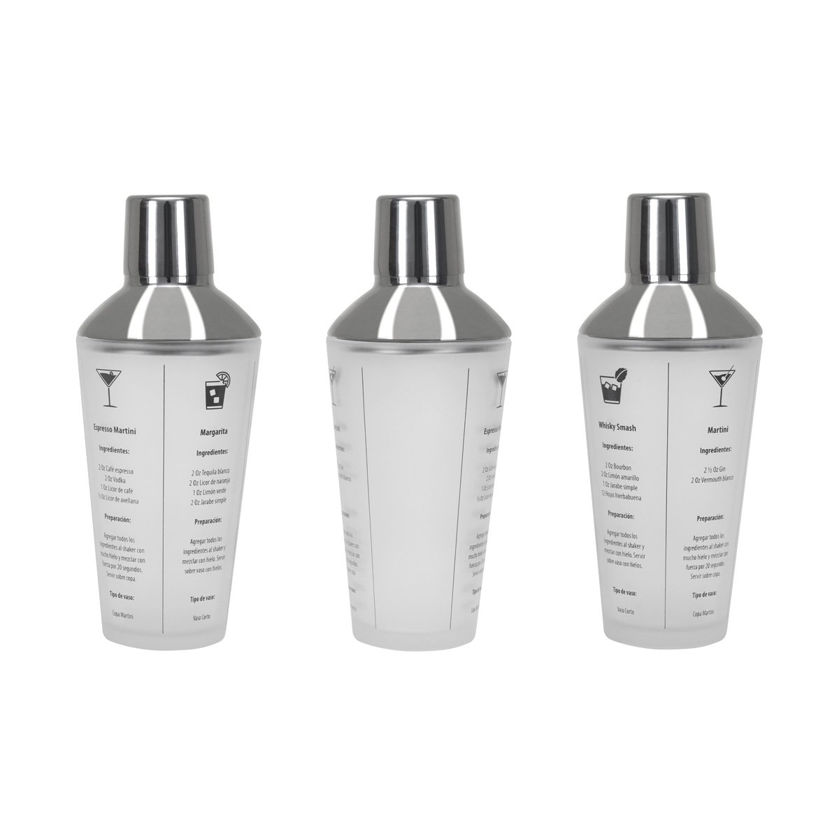 SHAKER METSI - Shaker de cristal con 4 recetas incluidas. Conviértete en el barman perfecto con este shaker diseñado para facilitar la preparación de cócteles profesionales en casa, guiándote paso a paso para crear bebidas como un experto. Podrás preparar un expresso martini, margarita, whisky smash o martini. Incluye caja individual.