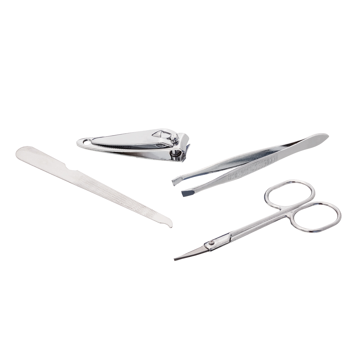 Set de manicura ovalado. - Set de manicura en estuche ovalado de metal, con 4 piezas (cortaúñas, lima de metal, pinzas para cutículas y tijeras).