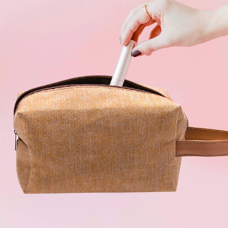 Cosmetiquera rectangular con asa para fácil manejo. Medidas: 18cm x 10.5cm x 9cm / correa 10cm Material: Poliéster. Empaque: Bolsa de celofán.