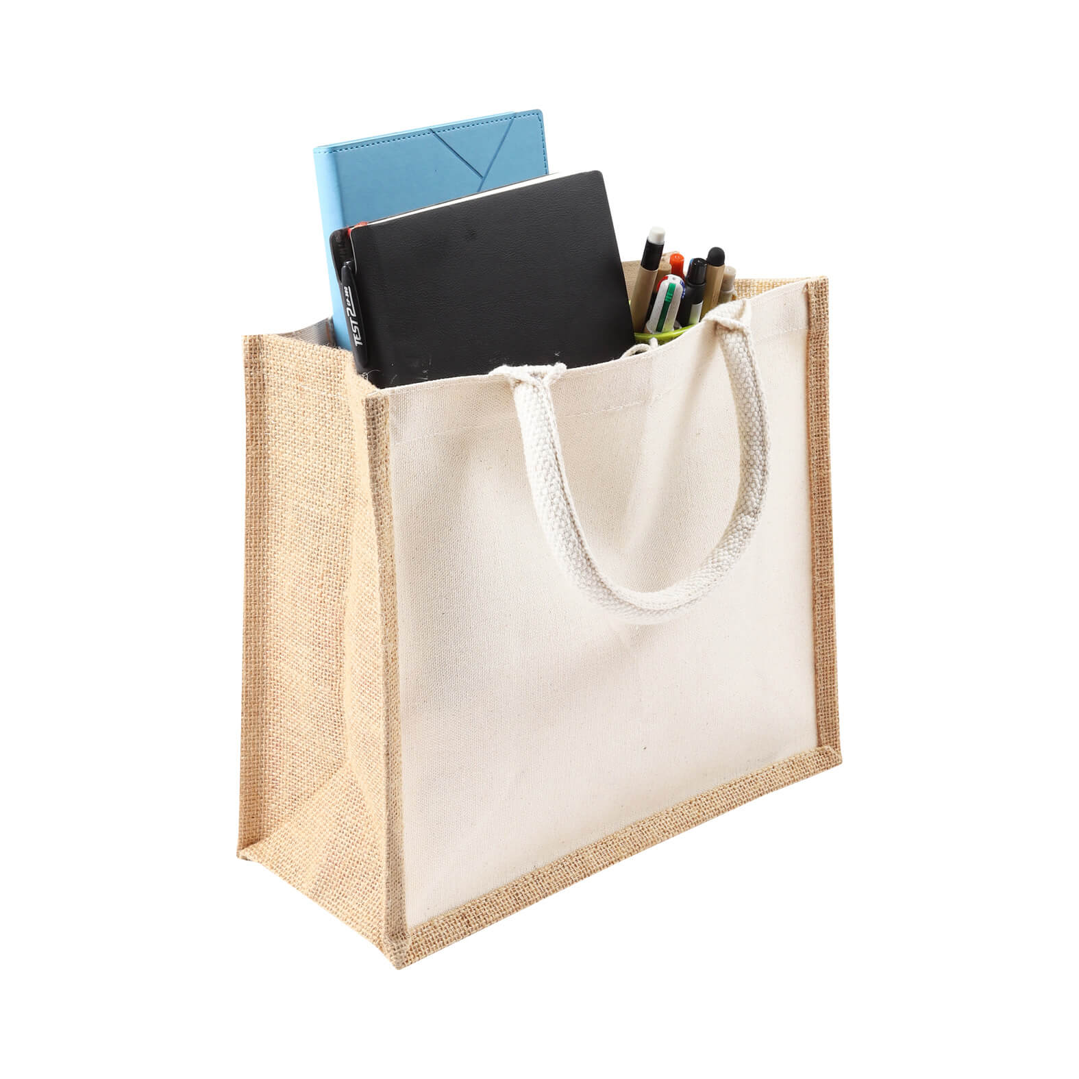 VEDA Bolsa de yute laminada con frente de loneta y asas de algodón.