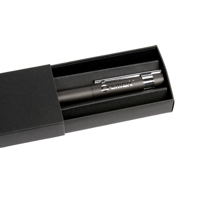 Bolígrafo en aluminio Kerner. - Bolígrafo fabricado en aluminio cromado negro. Cuenta con un mecanismo de giro twist, lo que permite extender y retraer la punta con facilidad. Incluye un estuche individual de cartón. Utiliza tinta de escritura negra.