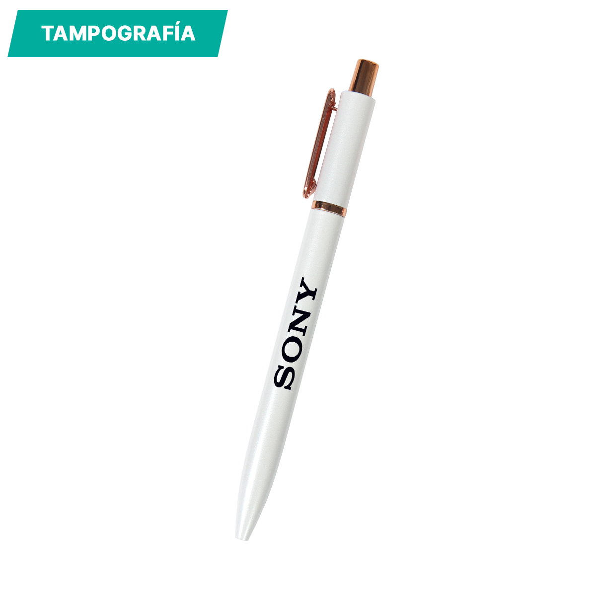 Bolígrafo Pangani. - Bolígrafo con barril de aluminio y detalles en metal cromado color rose gold es una elección elegante y sofisticada para tus necesidades de escritura, está equipado con tinta de escritura azul, incluye estuche de cartón individual, que agrega un toque adicional de elegancia y protección.