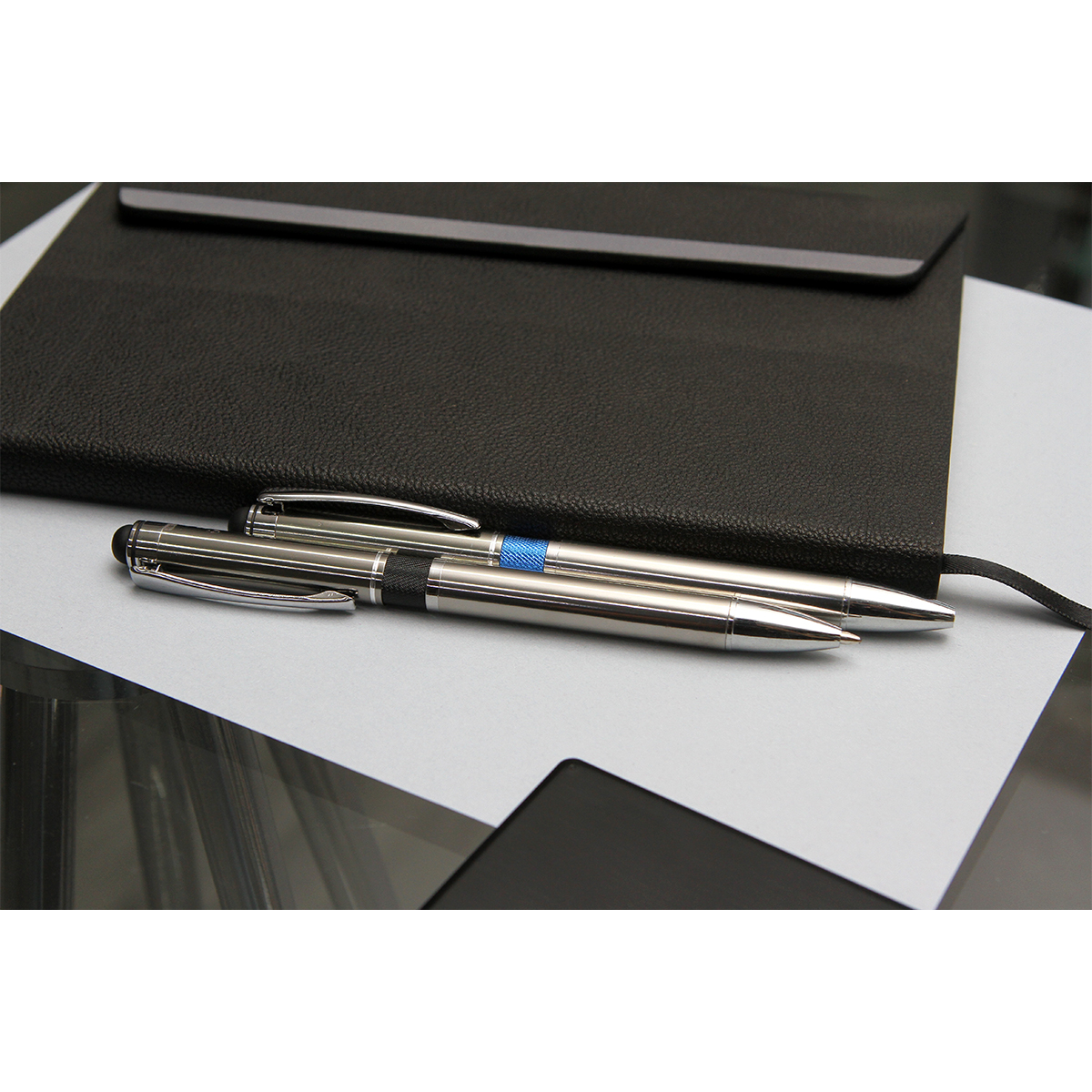 Bolígrafo Caprarola. - Bolígrafo con acción de empuje, con goma para pantallas táctiles en la parte de arriba, barril fabricado de aluminio acabado cromo plateado, clip de metal. X-20 slim refill. Tinta de escritura negra.