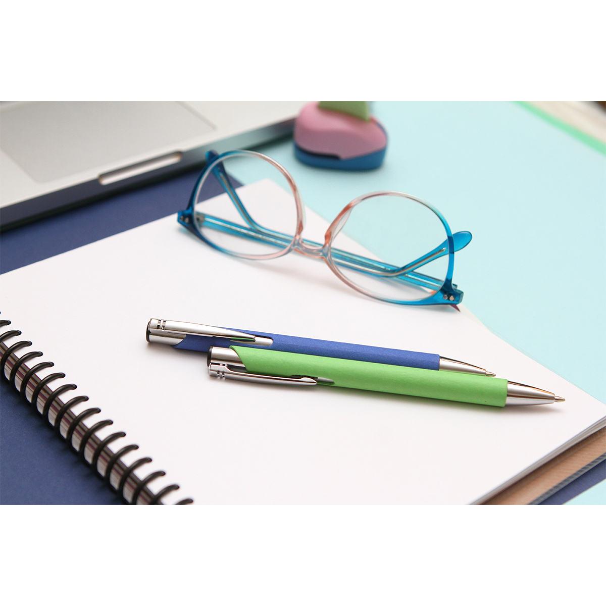 Bolígrafo Narni. - Bolígrafo ecológico con barril fabricado de papel reciclado, mecanismo de empuje y tinta de escritura negra. Disponible en colores vibrantes con detalles cromados. Escribe con estilo y cuida el planeta. Ideal para el día a día o regalar.