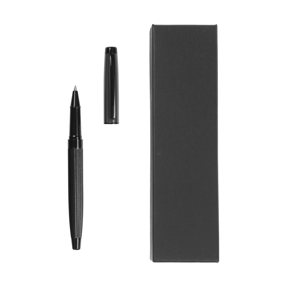 Bolígrafo Retiers. - Bolígrafo de con barril fabricado en acero inoxidable, con adornos en color negro, tipo roller pen, tinta de escritura negra. Incluye caja de regalo color negro.
