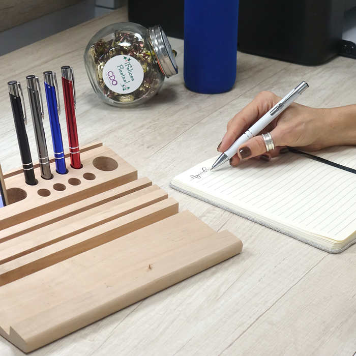 BOLÍGRAFO ¨BURMA¨ Cuerpo metálico de color. Clip, punta, y pulsador color plata. En el centro del bolígrafo cuenta con dos arandelas y más arriba finalizando el clip cuenta con una muesca color plata. Tinta negra
