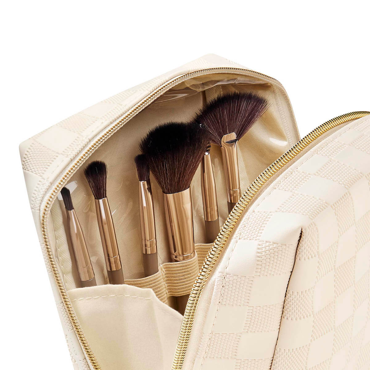 COSMETIQUERA JOANNA - Organizador de cosméticos.Compartimento con abertura amplia facilita el acceso y la organización de brochas y accesorios, manteniéndolos siempre en orden y a la vista. Además, la placa metálica al frente añade un toque de distinción. Ideal para quienes valoran la practicidad en su rutina de belleza.