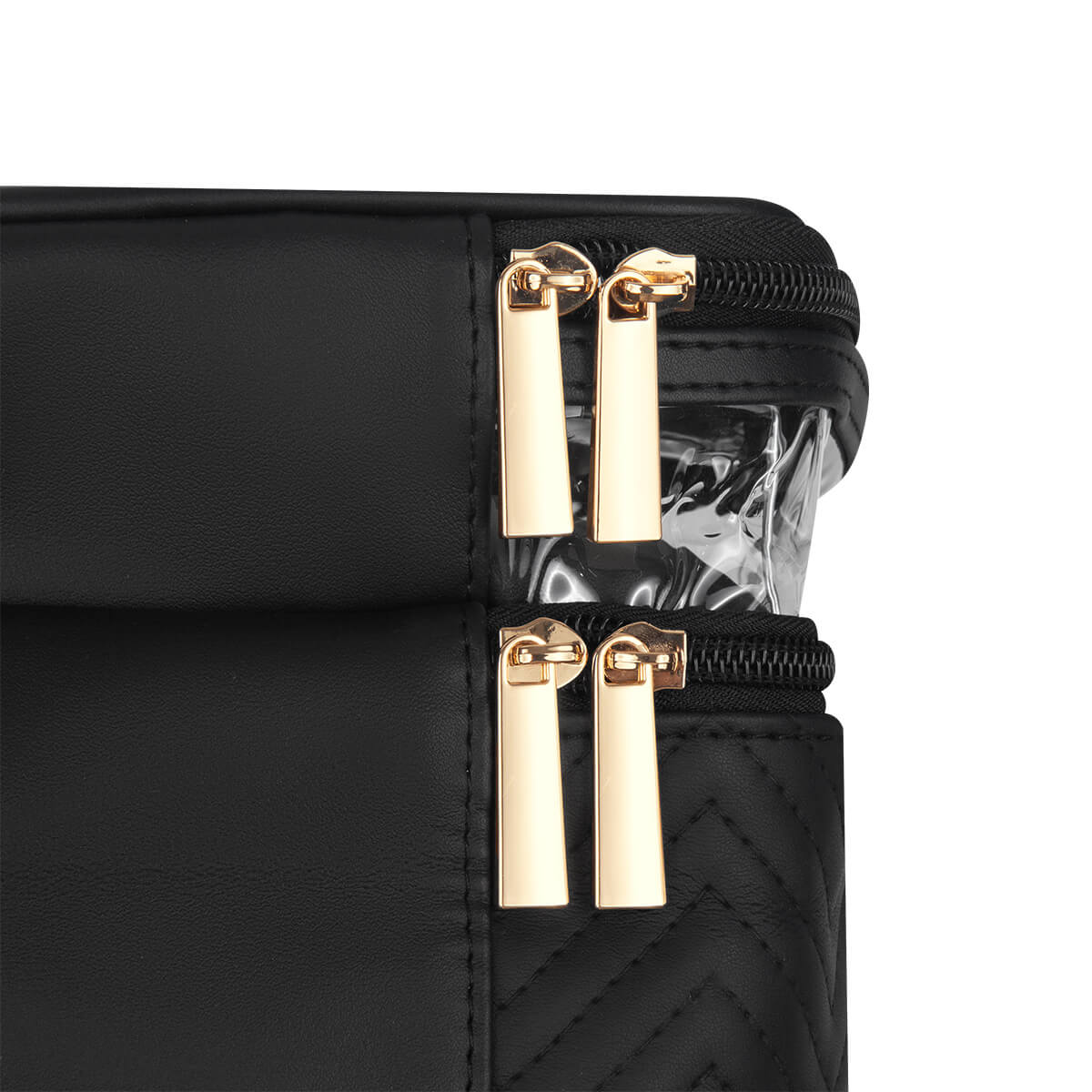 NECESER YARA - Neceser fabricado en PU con cuerpo semirrígido. Cuenta con dos niveles con cierre, ideales para organizar y separar productos de belleza o higiene personal. Su panel superior de mica transparente permite visualizar el contenido fácilmente, mientras que el asa facilita su transporte. Ideal para guardar productos de belleza, cuidado personal o maquillaje.
