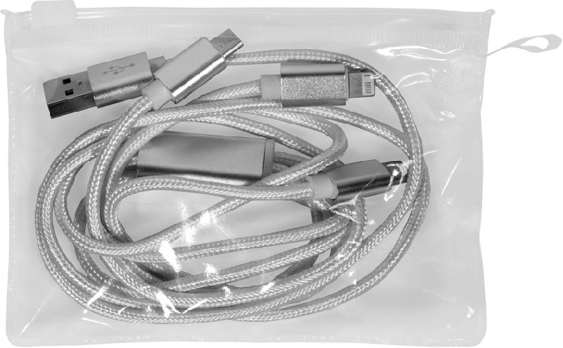 CABLE CON ADAPTADORES "MADISON" Cable con entrada USB y diferentes adaptadores: Iphone, tipo C y Android. Viene dentro de una bolsa plásticas con cierre ziploc.