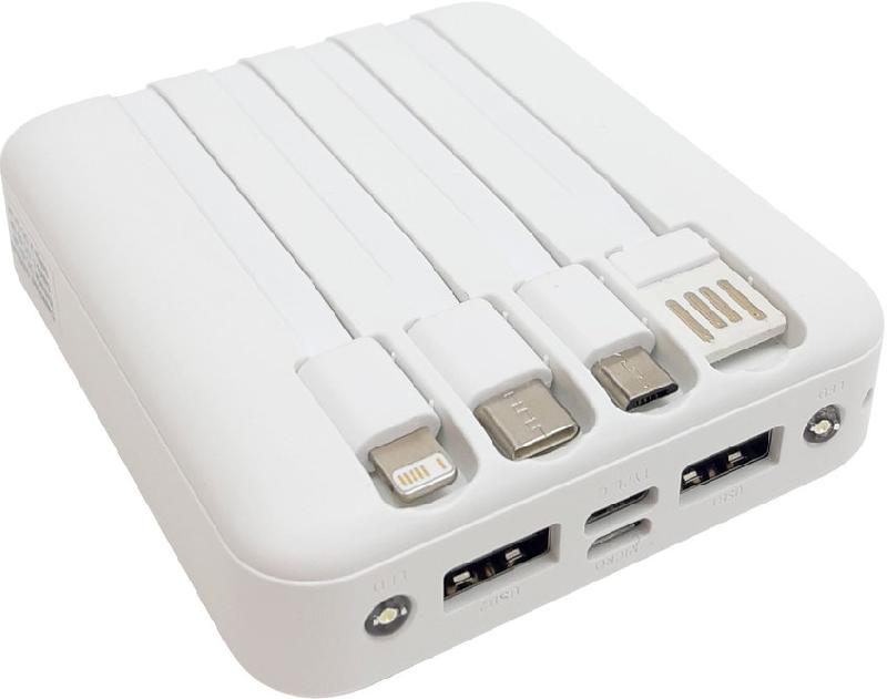POWERBANK MULTIPUERTO "CONNECTICUT" Powerbank multipuerto. Pantalla digital. Doble salida USB. Entradas micro-USB y USB tipo C. Salida de carga rápida 2A. Linterna dual led. 4 cables de carga integrados: USB, Micro USB, Tipo C y IPhone. Capacidad: 5000 mAh. Puede cargar hasta 5 dispositivos al tiempo. Presentación en caja de regalo.