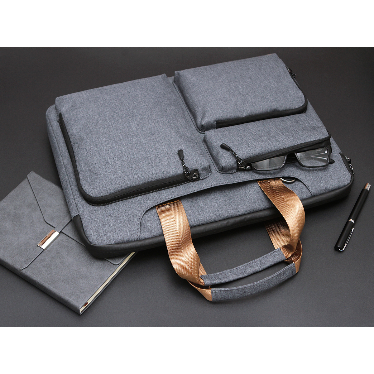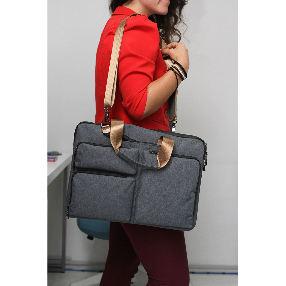 Porta laptop Cade. - Porta laptop con correa desmontable fabricado en poliéster, nylon y poliuretano. Con 3 bolsillos frontales con cierre y un bolsillo en la parte posterior. Cuenta con detalles en curpiel en la parte inferior y en las asas. Es un accesorio duradero diseñado para transportar de manera segura tu computadora, sus bolsillos frontales te permiten acceder rápidamente a tus pertenencias. Su correa ajustable te permite llevarla cómodamente al hombro o cruzada en el cuerpo.