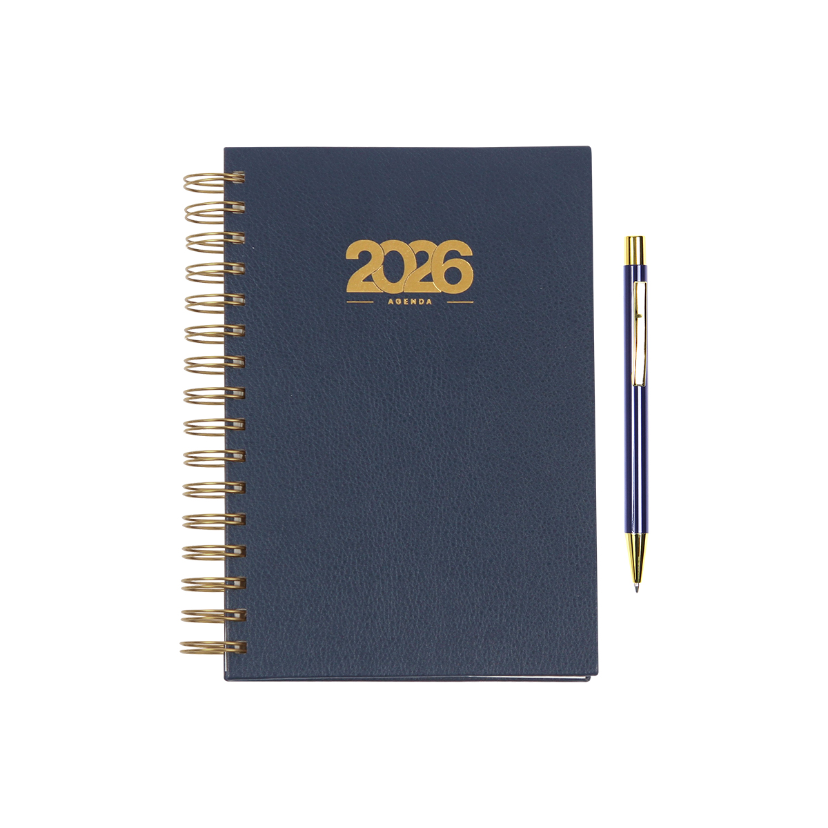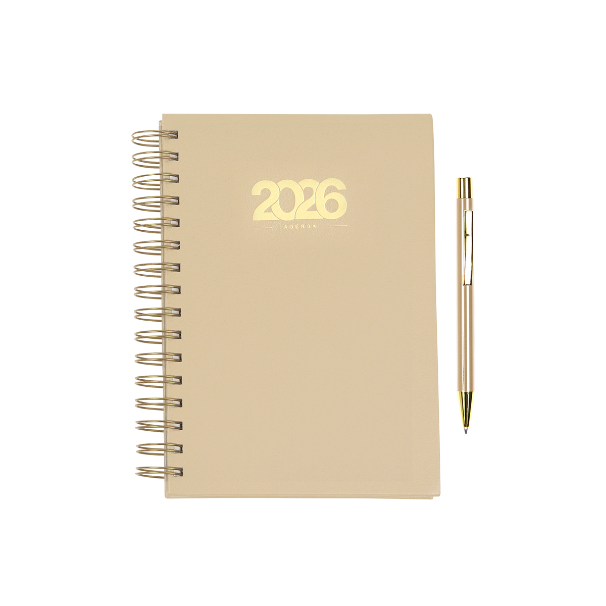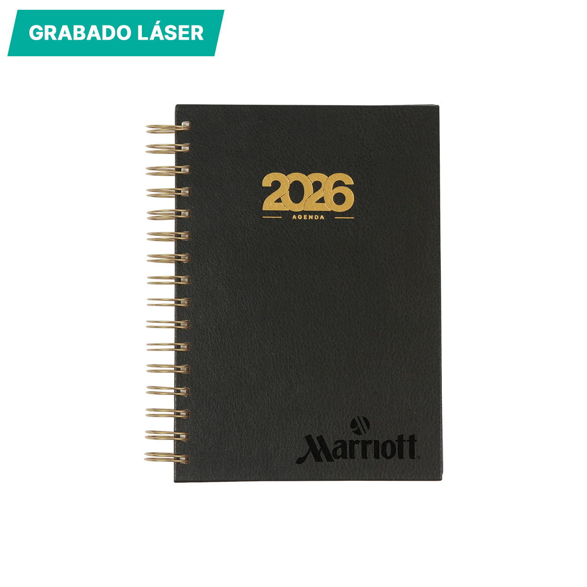 Agenda Diaria Bernetti. - Set de Agenda diaria 2026 con espiral, detalles en dorado, pluma y caja de regalo. Cubierta rígida fabricada en curpiel (PU) y espiral dorada e interior de 175 hojas de 65 g. (350 paginas) Cada día tiene espacio para tareas importantes y está organizada por horario (5:00 am -22:00 pm). Cuenta con: Separador de hojas, calendario anual 2025-2027, planeador mensual, hoja de objetivos anuales, hoja de pendientes mensuales, espacio para notas, tareas, sección de contactos y bolsillo interno para almacenar documentos. Incluye caja de cartón individual y bolígrafo con tinta de escritura negra.