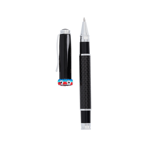 CISNEROS Bolígrafo de fibra de carbono con tapa metálica y estuche, decorado con arte huichol. Cada pieza está elaborada a mano con 120 chaquiras colocadas una a una por artesanos de Jalisco. Con cada compra apoyas el trabajo que representa el sustento económico de estas familias artesanas.