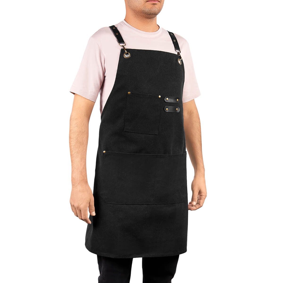 MANDIL SCHORT - Incluye tres bolsillos frontales: uno en la parte superior, ideal para objetos pequeños, y dos en la parte inferior, perfectos para herramientas, utensilios o accesorios. Cuenta con tirantes ajustables con hebillas metálicas y remaches que aportan mayor resistencia y un toque de estilo. Su diseño cruzado en la espalda ofrece mayor comodidad. Elaborado para entornos de trabajo exigentes, desde cocinas industriales hasta talleres o espacios creativos.