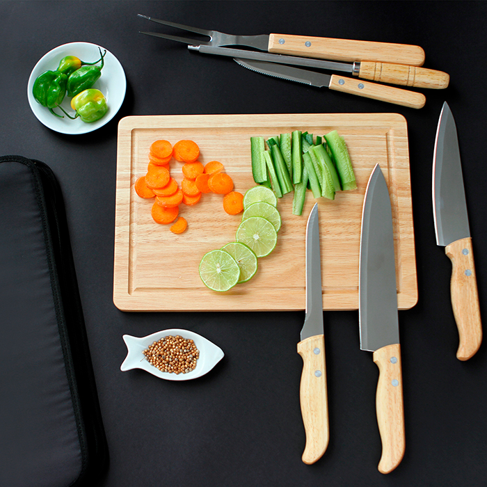 Set de Cuchillos. - Set de BBQ fabricado en acero inoxidable y mangos de roble, incluye 7 piezas (cuchillo de chef, cuchillo pequeño, cuchillo deshuesador, cuchillo para carne, tenedor, afilador y tabla para cortar de madera).